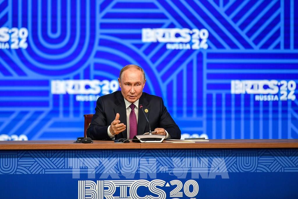 Ngày 24/10/2024, phát biểu tại Hội nghị cấp cao BRICS mở rộng, Tổng thống Nga Vladimir Putin nêu bật những tác động tiêu cực của các biện pháp trừng phạt đơn phương, chủ nghĩa bảo hộ, thao túng tiền tệ và thị trường chứng khoán, các hành động can thiệp vào công việc nội bộ của quốc gia khác. Tổng thống Putin tuyên bố ông hy vọng các các thảo luận mang tính xây dựng và cụ thể trong khuôn khổ BRICS mở rộng sẽ đóng góp vào giải quyết các vấn đề nóng hổi của khu vực và toàn cầu. Ảnh: THX/TTXVN