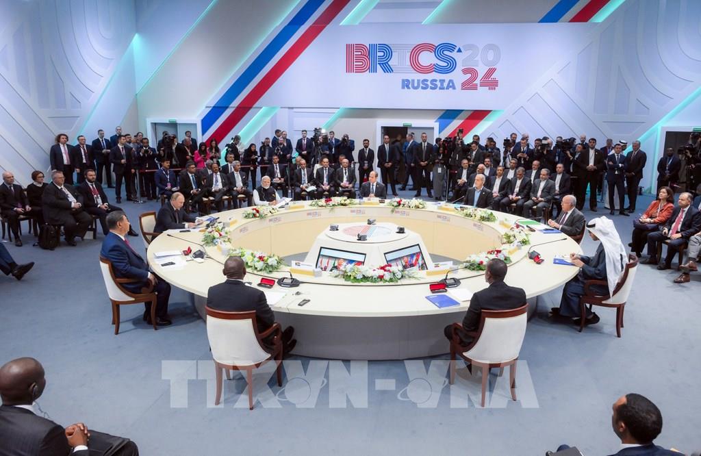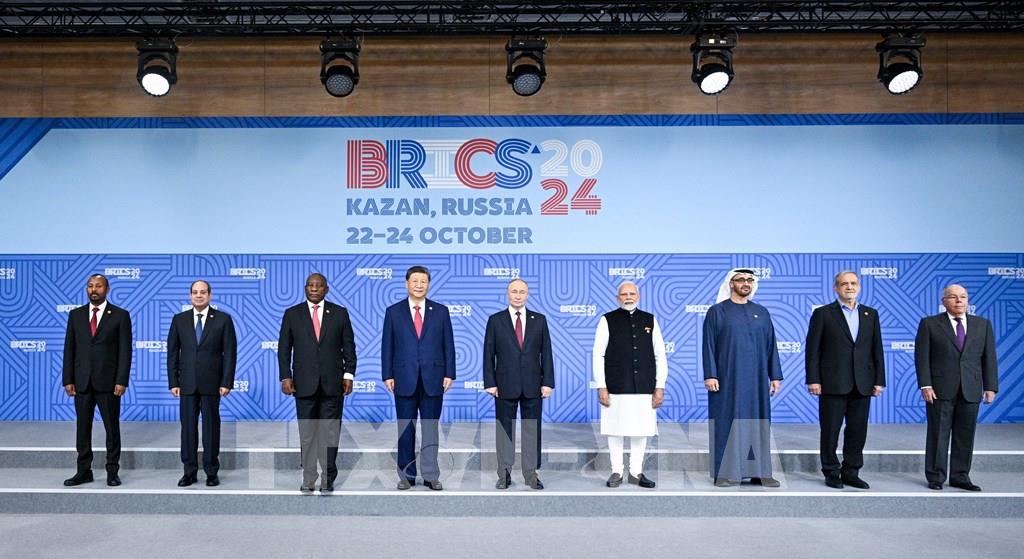 Ngày 23/10/2024, tại Hội nghị cấp cao BRICS diễn ra ở Kazan, Nga, lãnh đạo các nước thành viên đã thông qua tuyên bố chung, trong đó đưa ra những đánh giá tổng thể về tình hình thế giới cũng như các mục tiêu dài hạn của nhóm. Ảnh: THX/TTXVN