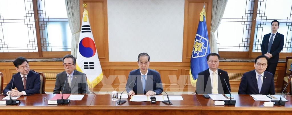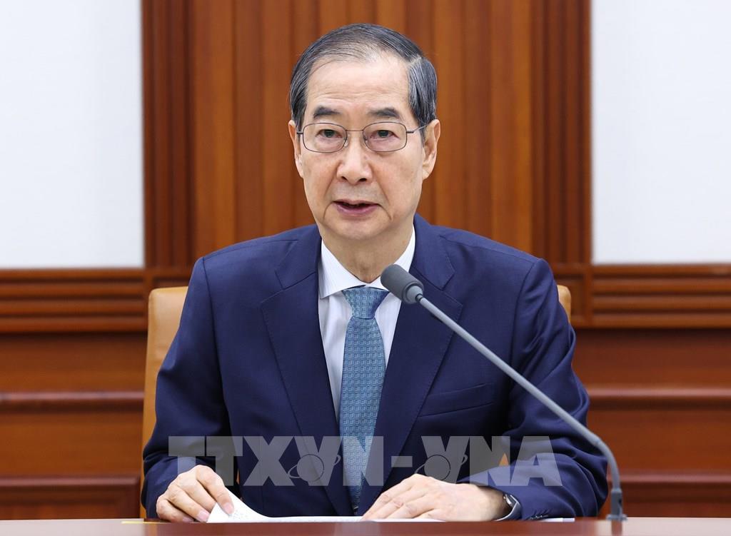 Quyền Tổng thống Hàn Quốc Han Duck Soo (ảnh) thông báo ngày 24/4/2025, nước này và Mỹ tiến hành "cuộc tham vấn thương mại 2+2” giữa Bộ trưởng Tài chính Choi Sang Mok và Bộ trưởng Công nghiệp Ahn Duk Geun với Bộ trưởng Tài chính Mỹ Scott Bessent và Đại diện Thương mại Jamieson Greer tại thủ đô Washington. Đây là vòng đàm phán cấp cao đầu tiên của quốc gia châu Á này nhằm thảo luận về giải pháp giảm thuế quan của Mỹ. Ảnh: YONHAP/TTXVN