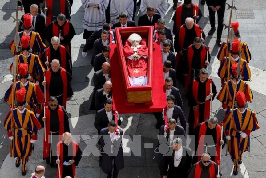 Tòa thánh Vatican ngày 21/4/2025 thông báo Giáo hoàng Francis đã qua đời, thọ 88 tuổi. Trước đó, hôm 14/2, Giáo hoàng đã phải nhập viện do bị viêm phổi. Vatican thông báo tang lễ của Giáo hoàng Francis sẽ được cử hành vào ngày 26/4 tại Quảng trường Thánh Peter. Ảnh: Thi hài của Đức Giáo hoàng được đưa đến Vương cung thánh đường Thánh Peter. Vatican Media/TTXVN
