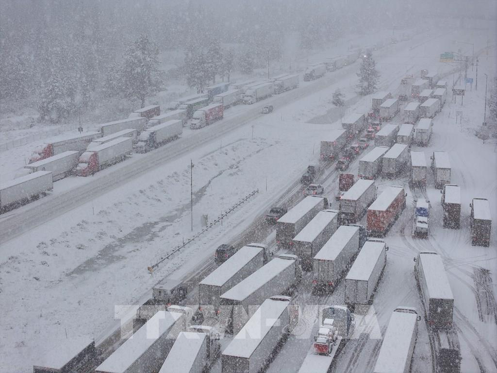 Một cơn bão mùa Đông mạnh đã tràn qua bang California của Mỹ vào ngày 24/12/2025, mang theo mưa lớn và gió giật mạnh, gây sạt lở bùn đất. Trong khi đó, ở phía Bắc bang, mưa lớn và tuyết dày gây điều kiện thời tiết nguy hiểm. Trong ảnh: Tuyết rơi dày đặc khiến giao thông ùn tắc tại California, Mỹ. Ảnh: AA/TTXVN