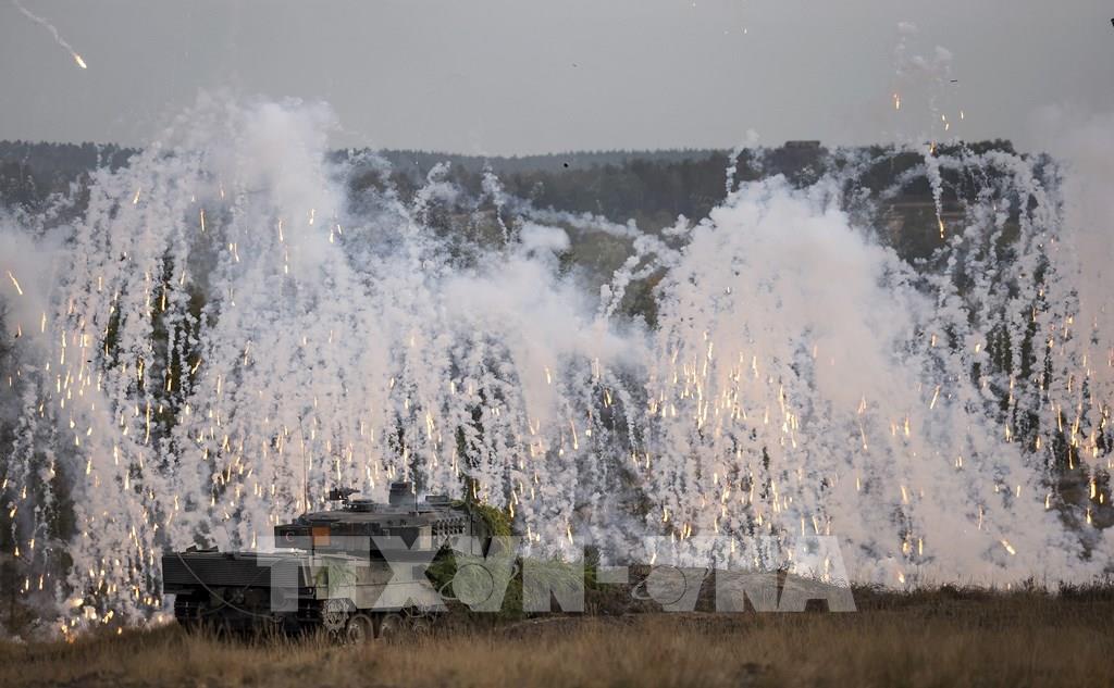 Phát biểu trong cuộc họp Nội các ngày 25/1/2023, Thủ tướng Đức Olaf Scholz thông báo nước này sẽ chuyển giao 2 đội xe tăng hiện đại Leopard 2, gồm 14 xe, cho Ukraine. Trong ảnh (tư liệu): Xe tăng Leopard 2 tham gia một cuộc tập trận ở Ostenholz, Đức, ngày 17/10/2022. Ảnh: AFP/ TTXVN