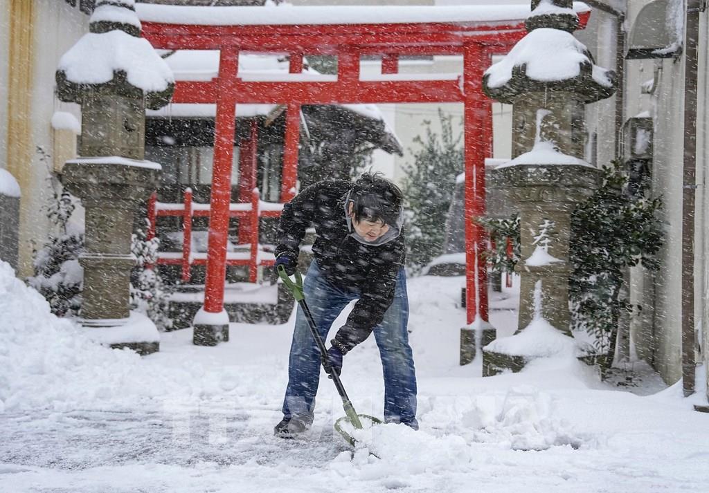 Ngày 25/1/2023, tuyết rơi dày tại Nhật Bản khiến hoạt động giao thông bị gián đoạn trên diện rộng và làm ít nhất 1 người thiệt mạng. Trong ảnh: Người dân dọn tuyết trên đường phố tại Tottori, Nhật Bản, ngày 25/1/2023. Ảnh: Kyodo/ TTXVN