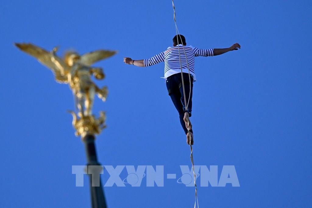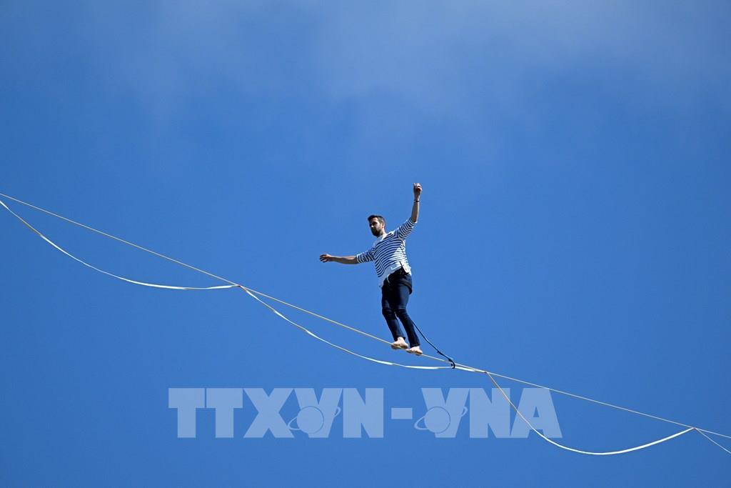 Ngày 24/5/2022, nghệ sĩ đi thăng bằng trên dây Nathan Paulin (người Pháp) thiết lập một kỷ lục thế giới mới sau khi anh hoàn thành quãng đường dài 2.200 mét đến Mont Saint-Michel trên một sợi cáp treo lơ lửng. Ảnh: AFP/ TTXVN