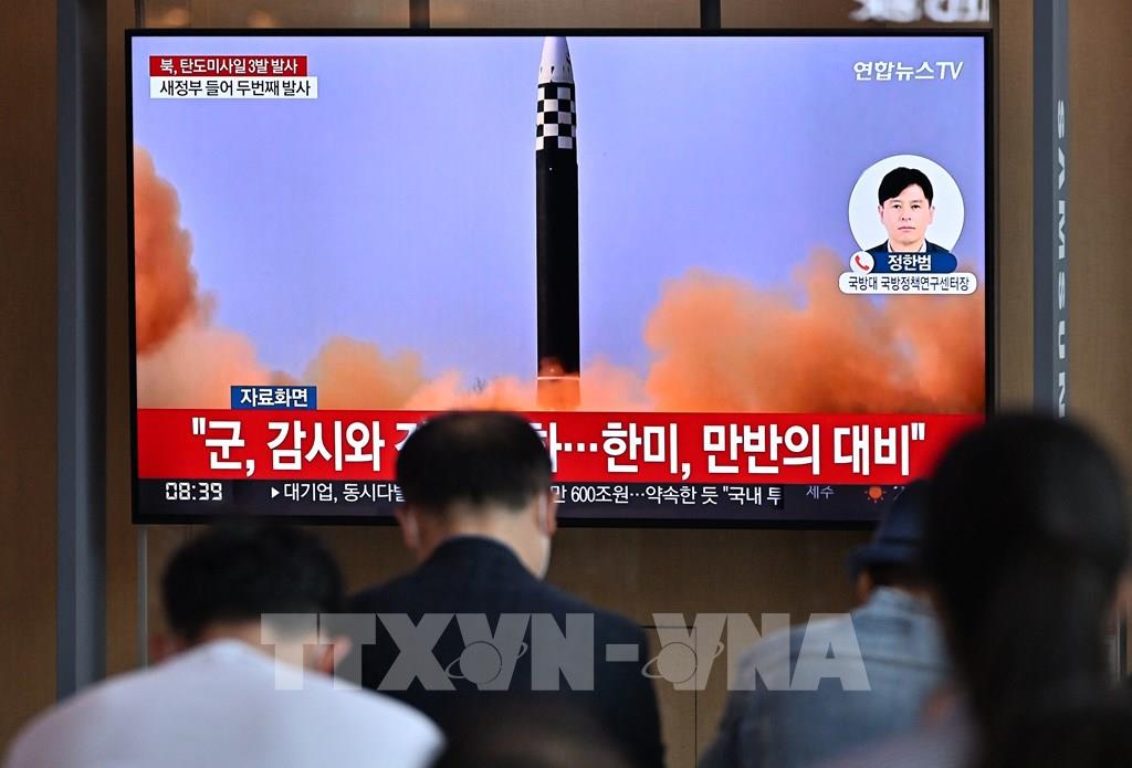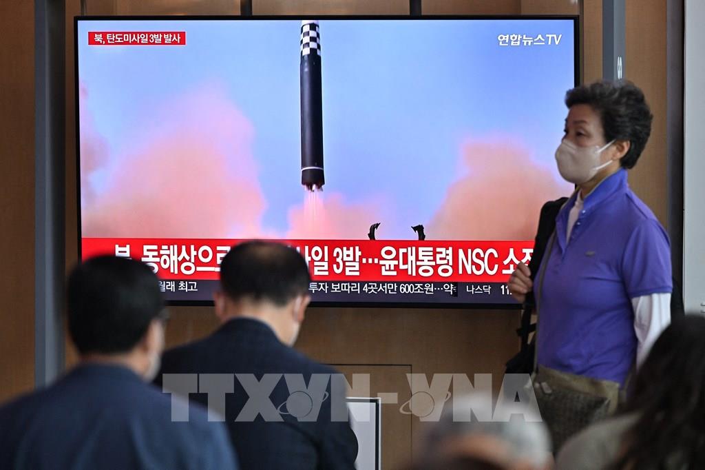Quân đội Hàn Quốc thông báo Triều Tiên đã phóng 3 tên lửa đạn đạo ra vùng biển phía Đông vào rạng sáng 25/5/2022, chỉ một ngày sau khi Tổng thống Joe Biden kết thúc chuyến công du châu Á đầu tiên trên cương vị lãnh đạo nước Mỹ. Trong ảnh: Người dân theo dõi qua màn hình tivi ở nhà ga Seoul, Hàn Quốc về vụ phóng thử được cho là tên lửa đạn đạo của Triều Tiên, ngày 25/5/2022. Ảnh: AFP/TTXVN