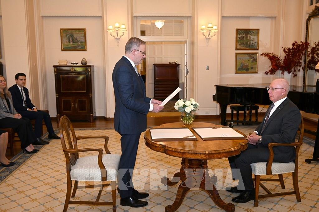 Ngày 22/5/2022, Thủ tướng đắc cử Australia Anthony Albanese nhấn mạnh ông muốn thay đổi đất nước Australia, theo đó sẽ thay đổi chính sách về khí hậu để cải thiện hình ảnh của nước này. Trong ảnh: Tân Thủ tướng Australia Anthony Albanese (trái) tuyên thệ nhậm chức trước Toàn quyền David Hurley ở Canberra, ngày 23/5/2022. Ảnh: AFP/TTXVN