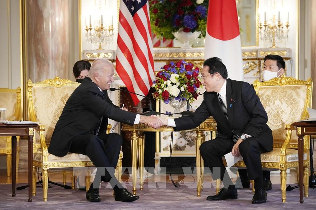 Trong khuôn khổ chuyến thăm chính thức Nhật Bản, ngày 23/5/2022, Tổng thống Mỹ Joe Biden (phải) hội đàm với Thủ tướng nước chủ nhà Kishida Fumio (trái) ở thủ đô Tokyo. Tại cuộc hội đàm, Tổng thống Mỹ Joe Biden tái khẳng định cam kết bảo vệ Nhật Bản, đồng thời tuyên bố liên minh Nhật Bản-Mỹ là “nền tảng” của hòa bình ở khu vực Ấn Độ Dương-Thái Bình Dương. Ảnh: Kyodo/ TTXVN