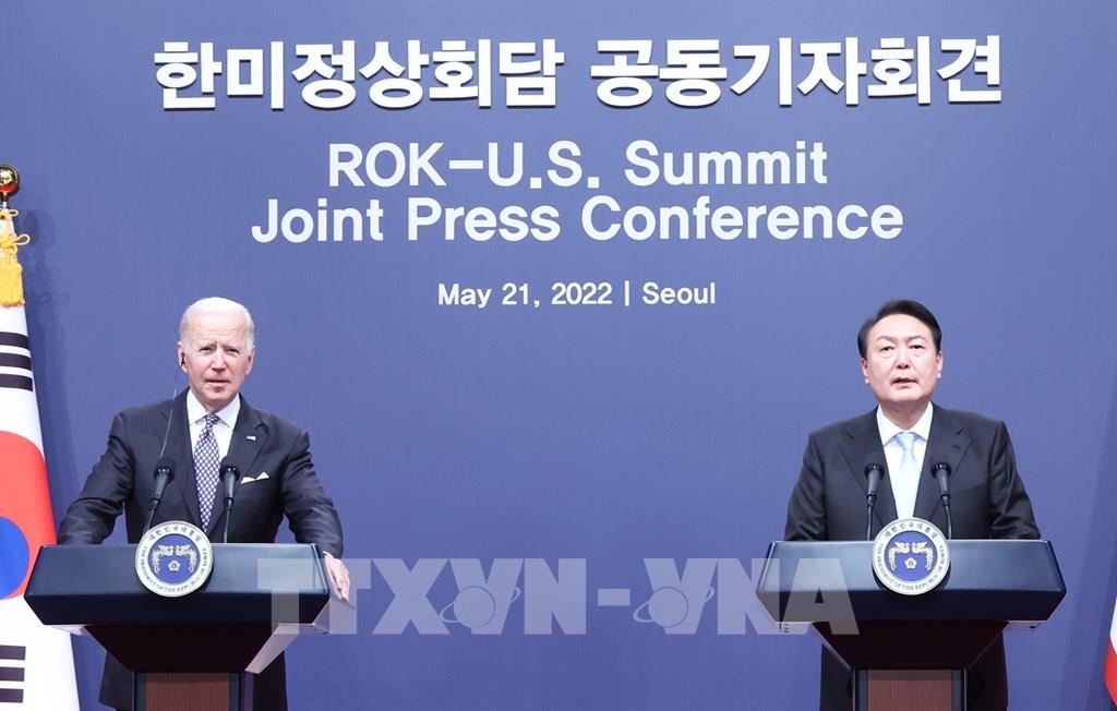 Tại cuộc hội đàm thượng đỉnh ngày 21/5/2022 ở thủ đô Seoul, Tổng thống Hàn Quốc Yoon Suk-yeol (phải) và Tổng thống Mỹ Joe Biden thảo luận sâu rộng nhiều vấn đề chiến lược song phương và quốc tế, trong đó có việc tăng cường toàn diện liên minh Hàn – Mỹ, đẩy mạnh hợp tác trong lĩnh vực an ninh, kinh tế và công nghệ cao, vấn đề phi hạt nhân hóa Bán đảo Triều Tiên và thách thức an ninh sau các vụ thử tên lửa của gần đây của Bình Nhưỡng. Ảnh: Yonhap/ TTXVN