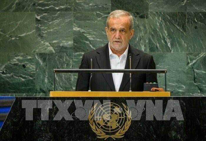 Ngày 24/9/2024, phát biểu tại cuộc họp của Đại hội đồng LHQ ở New York (Mỹ), Tổng thống Iran Masoud Pezeshkian tuyên bố nước này sẵn sàng chấm dứt thế bế tắc với phương Tây về vấn đề hạt nhân, đồng thời kêu gọi kết thúc cuộc xung đột Nga-Ukraine thông qua đối thoại. Ảnh: IRNA/TTXVN
