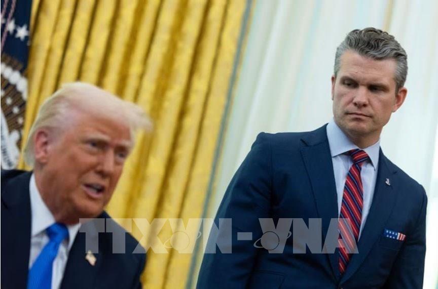 Nhà Trắng ngày 24/3/2025 cho biết các quan chức hàng đầu của Chính quyền Mỹ đã vô tình tiết lộ kế hoạch tấn công lực lượng Houthi tại Yemen trong một nhóm trò chuyện trên ứng dụng nhắn tin Signal. Trong một bài viết được đăng trên The Atlantic, ông Jeffrey Goldberg, Tổng biên tập tạp chí The Atlantic, cho biết ông vô tình được mời vào nhóm chat mật này. Trong ảnh: Bộ trưởng Quốc phòng Mỹ Pete Hegseth (phải) lắng nghe bài phát biểu của Tổng thống Mỹ Donald Trump tại Washington, D.C., ngày 21/3/2025. Ảnh: REUTERS/TTXVN