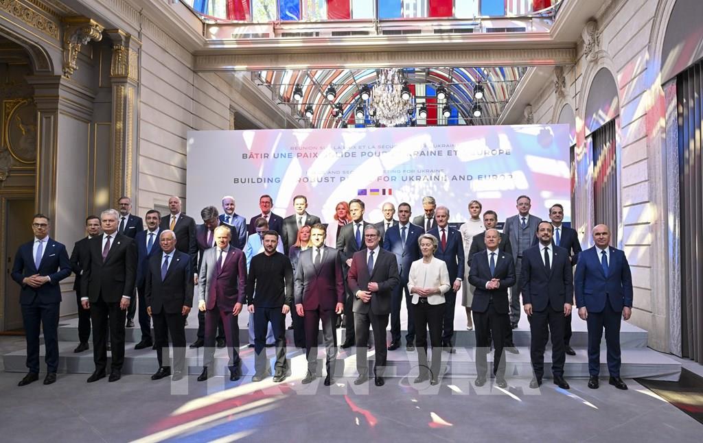 Ngày 27/3/2025, khoảng 30 nhà lãnh đạo các quốc gia châu Âu đã gặp Tổng thống Ukraine Volodymyr Zelensky tại Paris để thảo luận về việc tăng cường hỗ trợ quân sự cho Kiev và xác định vai trò của châu Âu trong các cuộc đàm phán giữa Nga và Ukraine. Đây là hội nghị thứ ba của “liên minh tự nguyện", liên minh những quốc gia ủng hộ Ukraine do Pháp và Anh dẫn đầu. Tại hội nghị, Tổng thống Pháp Emmanuel Macron tuyên bố nước này sẽ viện trợ quân sự thêm 2 tỷ euro (2,1 tỷ USD) cho Ukraine, nhằm trang bị thêm tên lửa, máy bay chiến đấu và củng cố hệ thống phòng không. Ảnh: Anadolu Agency/TTXVN