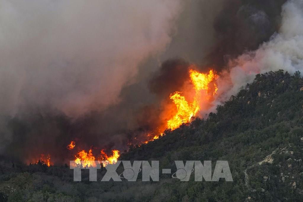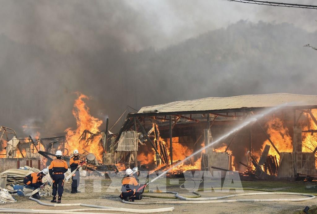 Các vụ cháy rừng tại hai tỉnh Ehime và Okayama ở miền Tây Nhật Bản tiếp tục lan rộng do gió mạnh bất chấp nỗ lực dập lửa. Ít nhất 8 tòa nhà bị thiêu rụi và hàng nghìn người đã phải sơ tán. Trong ảnh: Khói bốc ngùn ngụt từ đám cháy rừng tại Okayama, Nhật Bản, ngày 25/3/2025. Ảnh: Kyodo/TTXVN
