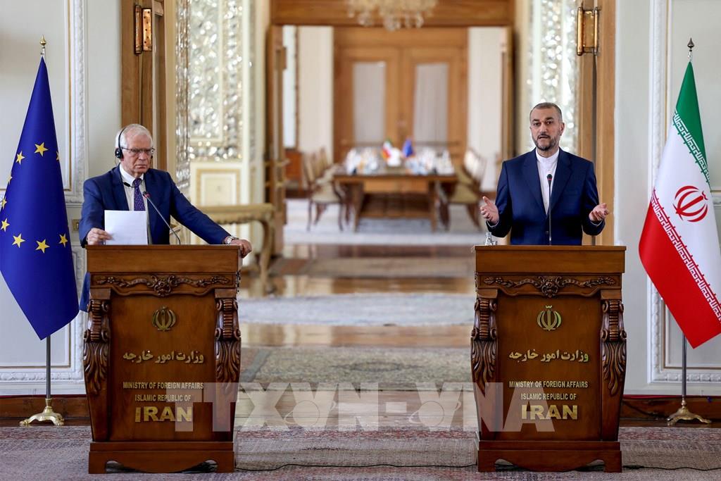 Trong cuộc điện đàm ngày 25/3/2024, Ngoại trưởng Iran Hossein Amir Abdollahian và Đại diện cấp cao phụ trách chính sách an ninh và đối ngoại của Liên minh châu Âu (EU) Josep Borrell đã nhấn mạnh tầm quan trọng của các cuộc đàm phán bền vững, cũng như việc trao đổi các chuyến thăm nhằm dỡ bỏ các lệnh trừng phạt đối với Tehran liên quan chương trình hạt nhân của nước này. Trong ảnh (tư liệu): Ngoại trưởng Iran Hossein Amir Abdollahian (phải) và Đại diện cấp cao phụ trách chính sách an ninh và đối ngoại của EU Josep Borrell tại cuộc họp báo ở Tehran ngày 25/6/2022. Ảnh: AFP/TTXVN