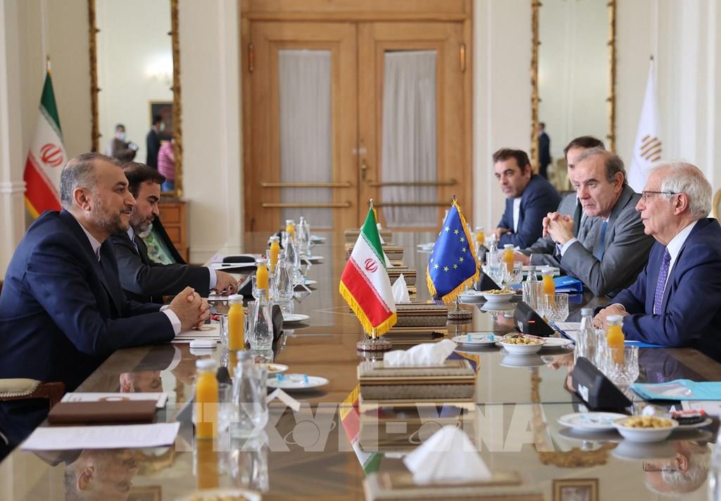Trong cuộc điện đàm ngày 25/3/2024, Ngoại trưởng Iran Hossein Amir Abdollahian và Đại diện cấp cao phụ trách chính sách an ninh và đối ngoại của Liên minh châu Âu (EU) Josep Borrell đã nhấn mạnh tầm quan trọng của các cuộc đàm phán bền vững, cũng như việc trao đổi các chuyến thăm nhằm dỡ bỏ các lệnh trừng phạt đối với Tehran liên quan chương trình hạt nhân của nước này. Trong ảnh (tư liệu): Ngoại trưởng Iran Hossein Amir Abdollahian (trái) và Đại diện cấp cao phụ trách chính sách an ninh và đối ngoại của EU Josep Borrell (phải) tại cuộc họp ở Tehran ngày 25/6/2022. Ảnh: AFP/TTXVN