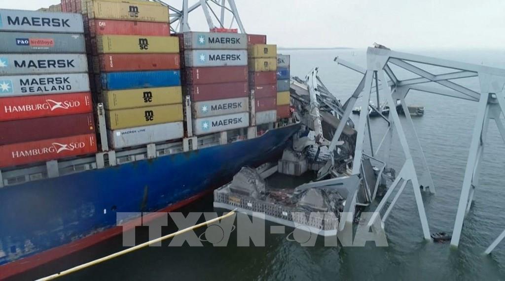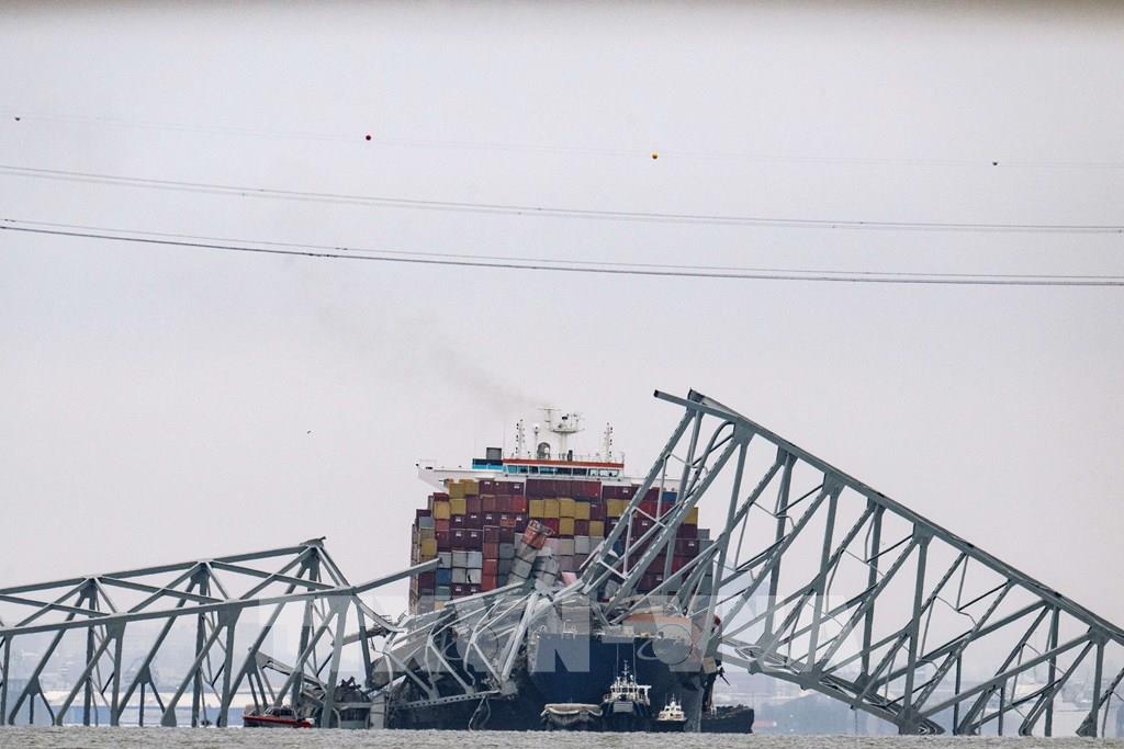 Ngày 26/3/2024, tàu container Dali treo cờ Singapore đã bất ngờ chết máy khi đang ra khỏi bến cảng Baltimore để hướng đến Sri Lanka và đâm thẳng vào cột trụ của cầu Francis Scott Key ở thành phố Baltimore thuộc bang Maryland (Mỹ). Gần như toàn bộ cây cầu thép này đã đổ sập chỉ trong vài giây, khiến nhiều người và phương tiện đang lưu thông trên cầu rơi xuống sông và chặn một trong những cảng thương mại đông đúc nhất nước Mỹ. Ảnh: AFP/TTXVN