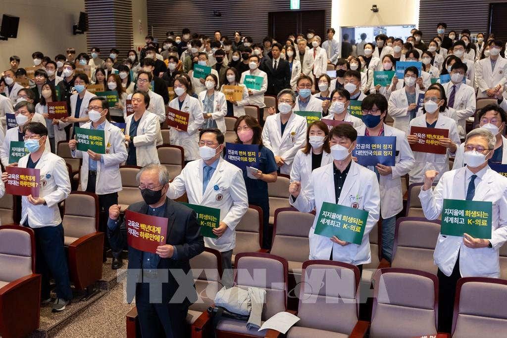 Ngày 25/3/2024, Hiệp hội Giáo sư Y khoa Hàn Quốc cho biết các giáo sư y khoa của 19 trong số 40 trường y trên toàn quốc đã ký một tuyên bố chung phản đối kế hoạch tăng chỉ tiêu tuyển sinh của Chính phủ và thông báo bắt đầu nộp đơn xin nghỉ việc ngay trong ngày. Động thái trên cho thấy căng thẳng y tế kéo dài hơn một tháng qua ở Hàn Quốc chưa có dấu hiệu giảm nhiệt bất chấp nỗ lực kêu gọi đối thoại của Chính phủ. Trong ảnh: Các giáo sư y khoa biểu tình phản đối kế hoạch tăng chỉ tiêu tuyển sinh của Chính phủ tại trường Đại học Hàn Quốc ở Seoul ngày 25/3/2024. Ảnh: Yonhap/TTXVN