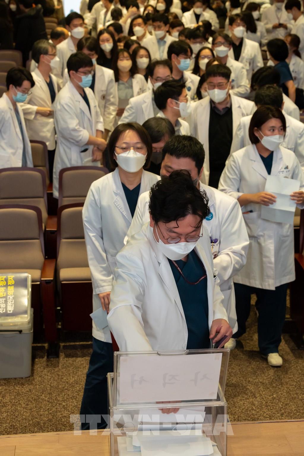 Ngày 25/3/2024, Hiệp hội Giáo sư Y khoa Hàn Quốc cho biết các giáo sư y khoa của 19 trong số 40 trường y trên toàn quốc đã ký một tuyên bố chung phản đối kế hoạch tăng chỉ tiêu tuyển sinh của Chính phủ và thông báo bắt đầu nộp đơn xin nghỉ việc ngay trong ngày. Động thái trên cho thấy căng thẳng y tế kéo dài hơn một tháng qua ở Hàn Quốc chưa có dấu hiệu giảm nhiệt bất chấp nỗ lực kêu gọi đối thoại của Chính phủ. Trong ảnh: Các giáo sư y khoa nộp đơn nghỉ việc tại trường Đại học Hàn Quốc ở Seoul ngày 25/3/2024. Ảnh: Yonhap/TTXVN