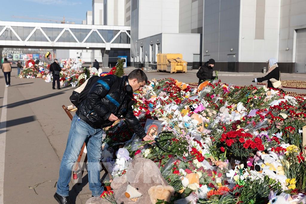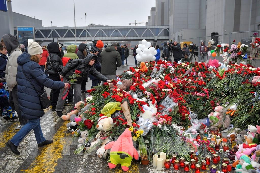 Ít nhất 139 người đã thiệt mạng và 360 người bị thương trong vụ khủng bố kinh hoàng tại nhà hát Crocus City Hall ở ngoại ô thủ đô Moskva, Nga ngày 22/3/2024. Nhà chức trách Nga đã bắt giữ 11 đối tượng tình nghi, trong đó 4 đối tượng tình nghi trực tiếp thực hiện vụ tấn công bị buộc tội khủng bố. Trong ảnh: Người dân đặt hoa tưởng niệm các nạn nhân thiệt mạng trong vụ tấn công ở Moskva, Nga, ngày 24/3/2024. Ảnh: THX/TTXVN