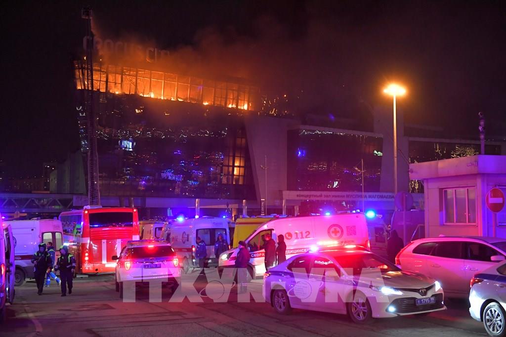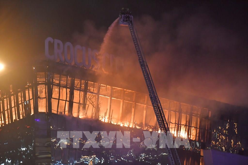 Ít nhất 139 người đã thiệt mạng và 360 người bị thương trong vụ khủng bố kinh hoàng tại nhà hát Crocus City Hall ở ngoại ô thủ đô Moskva, Nga ngày 22/3/2024. Nhà chức trách Nga đã bắt giữ 11 đối tượng tình nghi, trong đó 4 đối tượng tình nghi trực tiếp thực hiện vụ tấn công bị buộc tội khủng bố. Trong ảnh: Hiện trường vụ tấn công ở Moskva, Nga, ngày 22/3/2024. Ảnh: THX/TTXVN