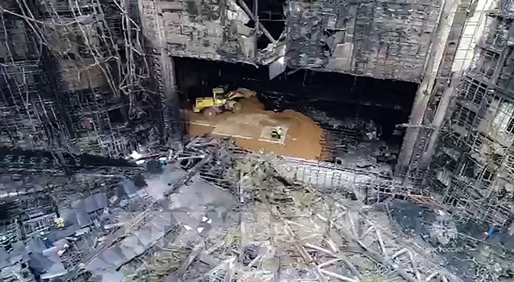 Ít nhất 139 người đã thiệt mạng và 360 người bị thương trong vụ khủng bố kinh hoàng tại nhà hát Crocus City Hall ở ngoại ô thủ đô Moskva, Nga ngày 22/3/2024. Nhà chức trách Nga đã bắt giữ 11 đối tượng tình nghi, trong đó 4 đối tượng tình nghi trực tiếp thực hiện vụ tấn công bị buộc tội khủng bố. Trong ảnh: Hiện trường vụ tấn công ở Moskva, Nga, ngày 26/3/2024. Ảnh: AFP/TTXVN