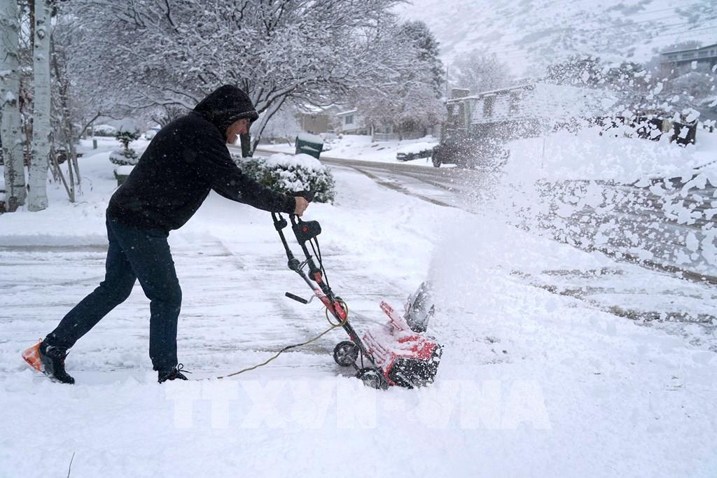 "Trận bão tuyết thế kỷ" tại Mỹ đã khiến ít nhất 50 người thiệt mạng, hơn 1 triệu người rơi vào cảnh mất điện và hàng nghìn chuyến bay bị hoãn, hủy. Trong ảnh: Người dân dọn tuyết trên đường phố tại Provo, Utah, Mỹ. Ảnh: AFP/ TTXVN