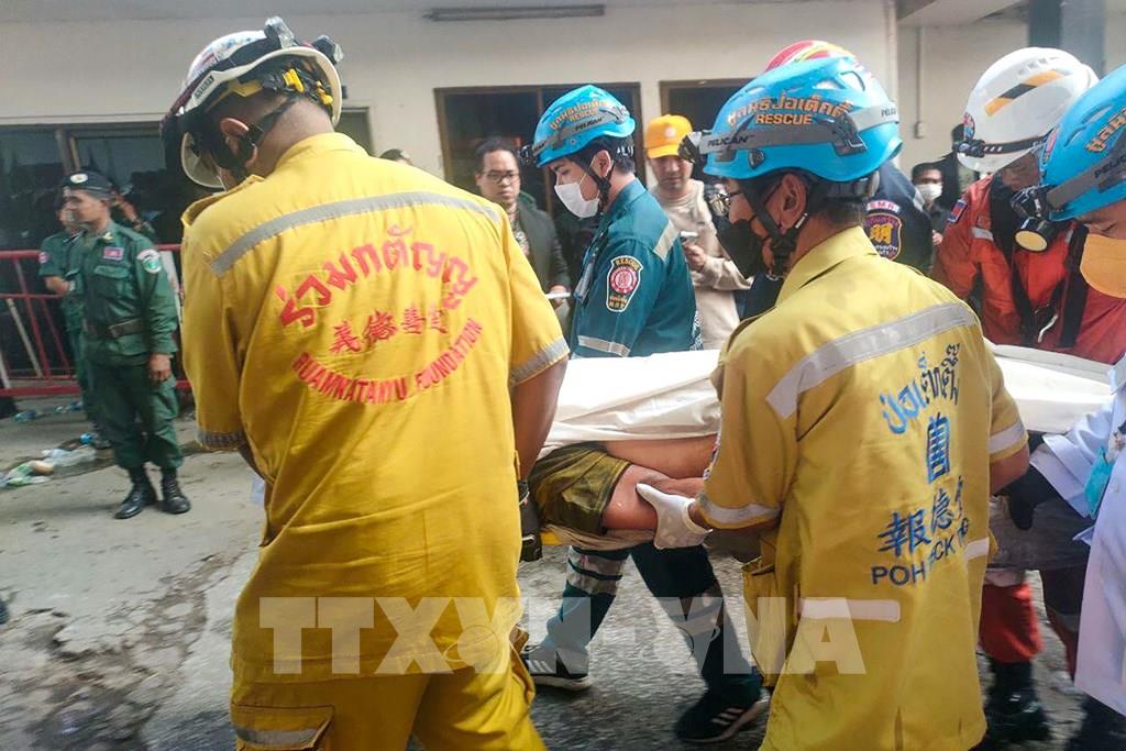 Hỏa hoạn đã bùng phát tại khu tổ hợp sòng bài và khách sạn Grand Diamond City ở thành phố Poipet, tỉnh Banteay Meanchey, Campuchia ngày 28/12/2022, khiến 19 người thiệt mạng và khoảng 100 người bị thương.Trong ảnh: Lực lượng cứu hộ chuyển nạn nhân tại hiện trường vụ hỏa hoạn. Ảnh: AFP/ TTXVN
