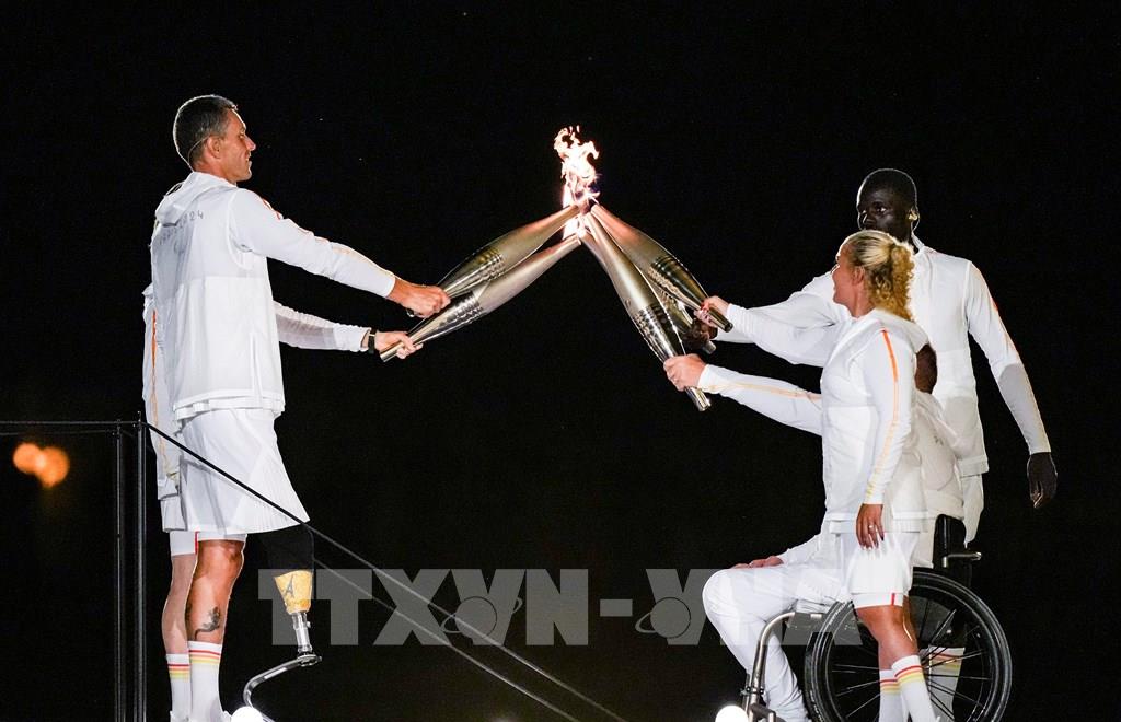 Ngày 28/8/2024, Pháp khai mạc Thế vận hội thể thao dành cho người khuyết tật (Paralympic 2024) trên quảng trường Concorde và Đại lộ Champs-Elysees ở thủ đô Paris với chủ đề "Ngày hội hòa nhập của người khuyết tật và của những xúc cảm đan xen". Ảnh: Các VĐV cùng nhau thắp sáng ngọn đuốc tại lễ khai mạc. THX/TTXVN
