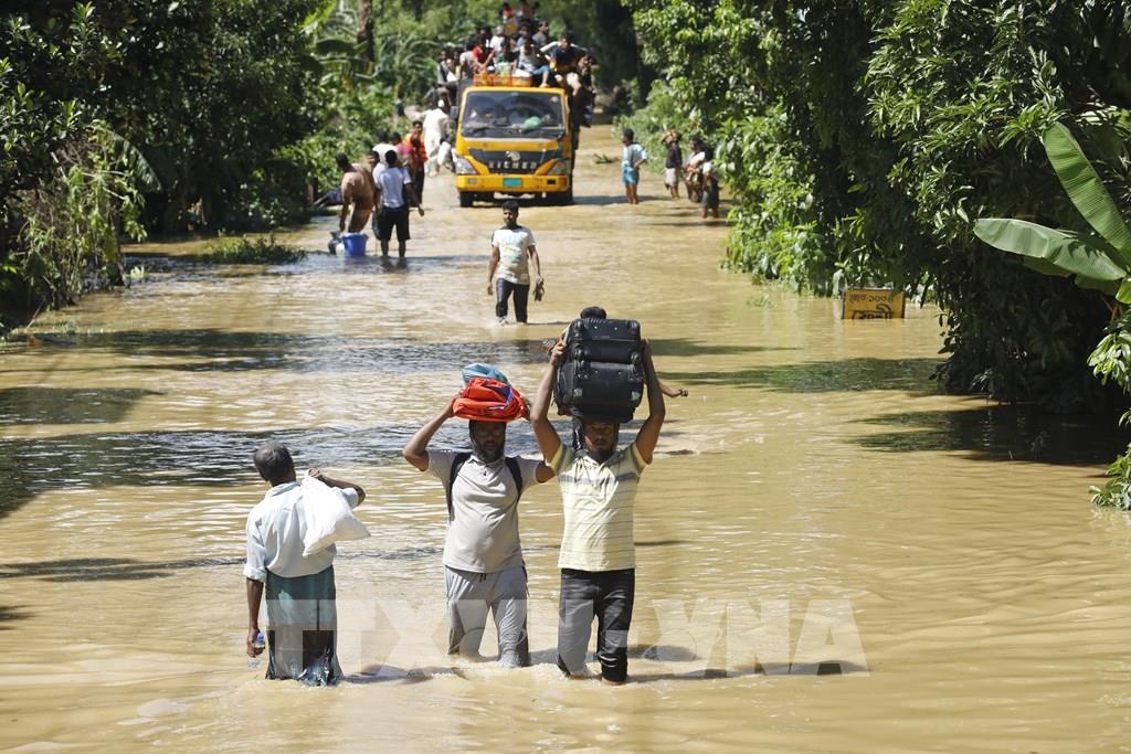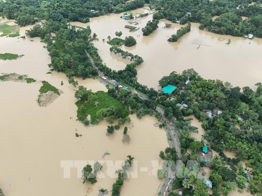 Theo báo cáo của Trung tâm điều phối ứng phó thảm họa quốc gia (NDRCC) thuộc Bộ quản lý và cứu trợ thiên tai Bangladesh, đến nay, lũ lụt tại 11 trong tổng số 64 huyện của nước này đã khiến 23 người thiệt mạng và 5,7 triệu người bị ảnh hưởng. Ảnh: Toàn cảnh thành phố Cumilla chìm trong nước lũ, ngày 23/8/2024. Ảnh: THX/TTXVN