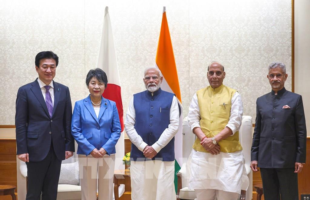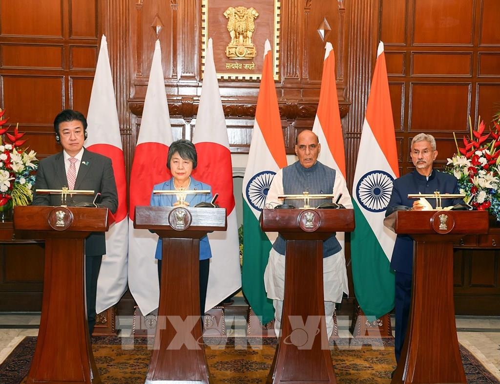 Ấn Độ và Nhật Bản đã đạt được nhiều thỏa thuận quan trọng về hợp tác an ninh và quốc phòng tại Hội nghị Bộ trưởng Ngoại giao và Quốc phòng 2+2 lần thứ ba diễn ra ở New Delhi ngày 20/8/2024. Hai nước nhất trí xây dựng khuôn khổ mới cho hợp tác an ninh, phù hợp với mong muốn mở rộng quan hệ chiến lược tổng thể. Ảnh: ANI/TTXVN