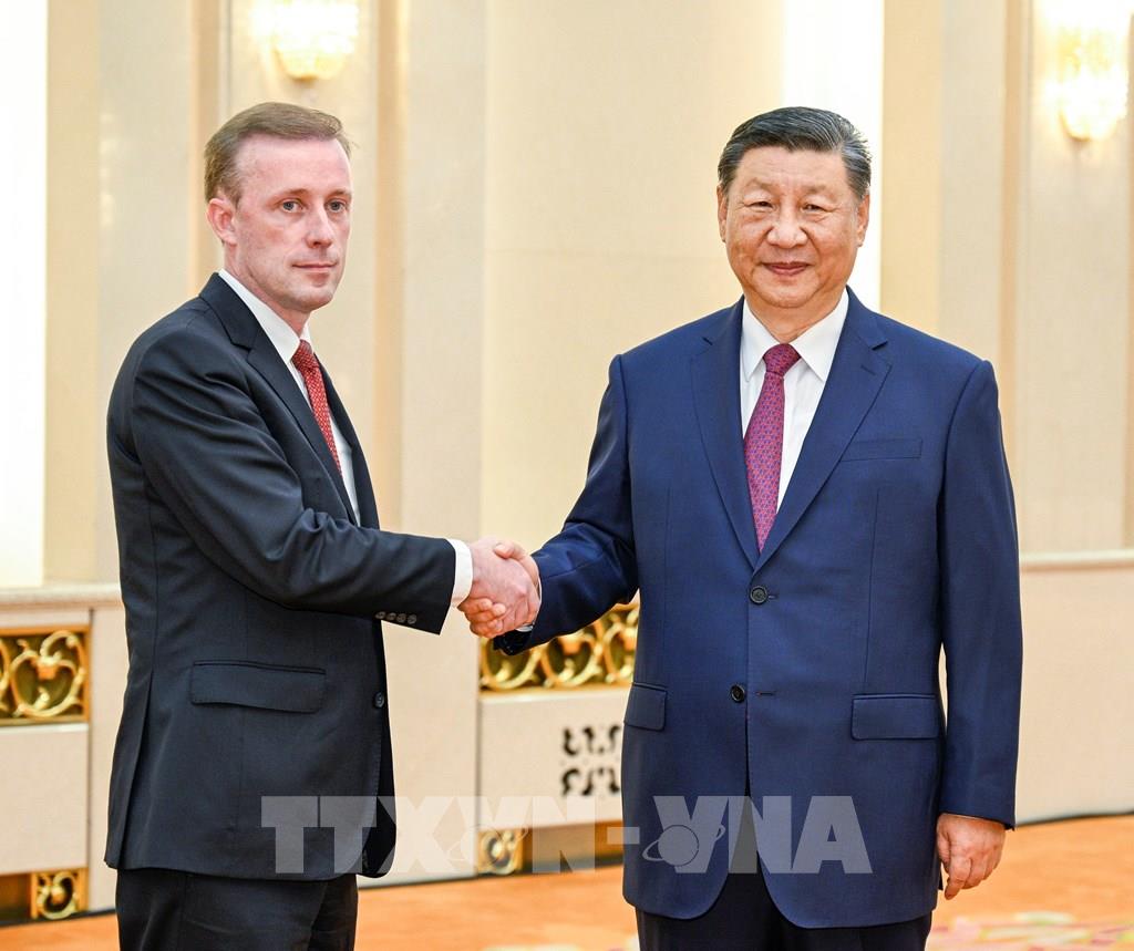 Ngày 29/8/2024, trong cuộc tiếp Cố vấn An ninh quốc gia Mỹ Jake Sullivan (trái) ở Bắc Kinh, Chủ tịch Trung Quốc Tập Cận Bình tuyên bố Bắc Kinh cam kết xây dựng mối quan hệ với Mỹ "dựa trên sự tôn trọng lẫn nhau và hợp tác cùng có lợi". Trước đó, Bộ trưởng Ngoại giao Trung Quốc Vương Nghị và ông Jake Sullivan đã tiến hành vòng trao đổi chiến lược mới giữa hai nước nhằm thúc đẩy quan hệ Trung-Mỹ vượt qua những trở ngại và thách thức, thực sự đạt được sự phát triển ổn định, lành mạnh và bền vững. Ảnh: THX/TTXVN