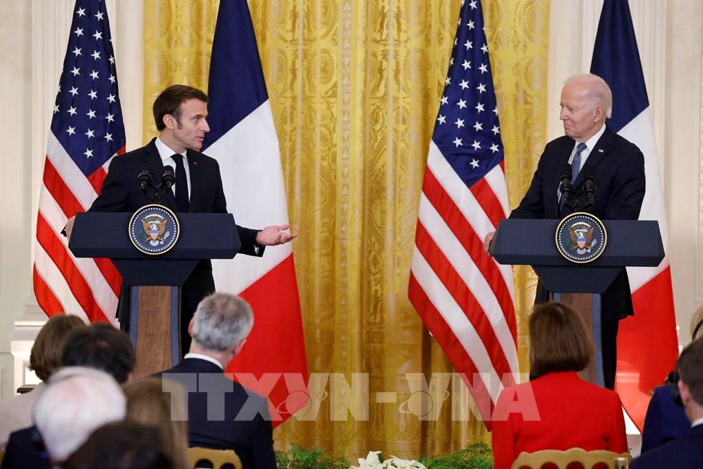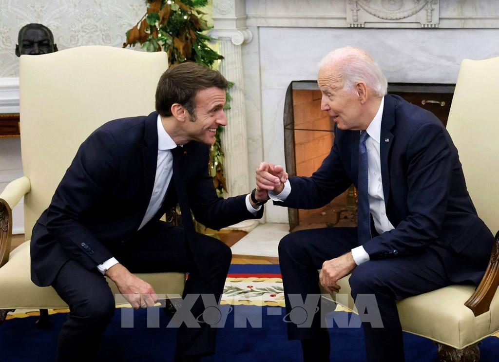 Ngày 30/11 và 1/12/2022, Tổng thống Pháp Emmanuel Macron (trái) đã có chuyến thăm chính thức cấp nhà nước đầu tiên của một nhà lãnh đạo nước ngoài tới Mỹ, kể từ khi Tổng thống Joe Biden lên nắm quyền. Chuyến thăm không chỉ củng cố quan hệ đồng minh hai nước sau những bất đồng mà còn cho thấy tín hiệu tích cực về phạm vi hợp tác xuyên Đại Tây Dương mà Paris hy vọng thúc đẩy. Ảnh: AFP/TTXVN