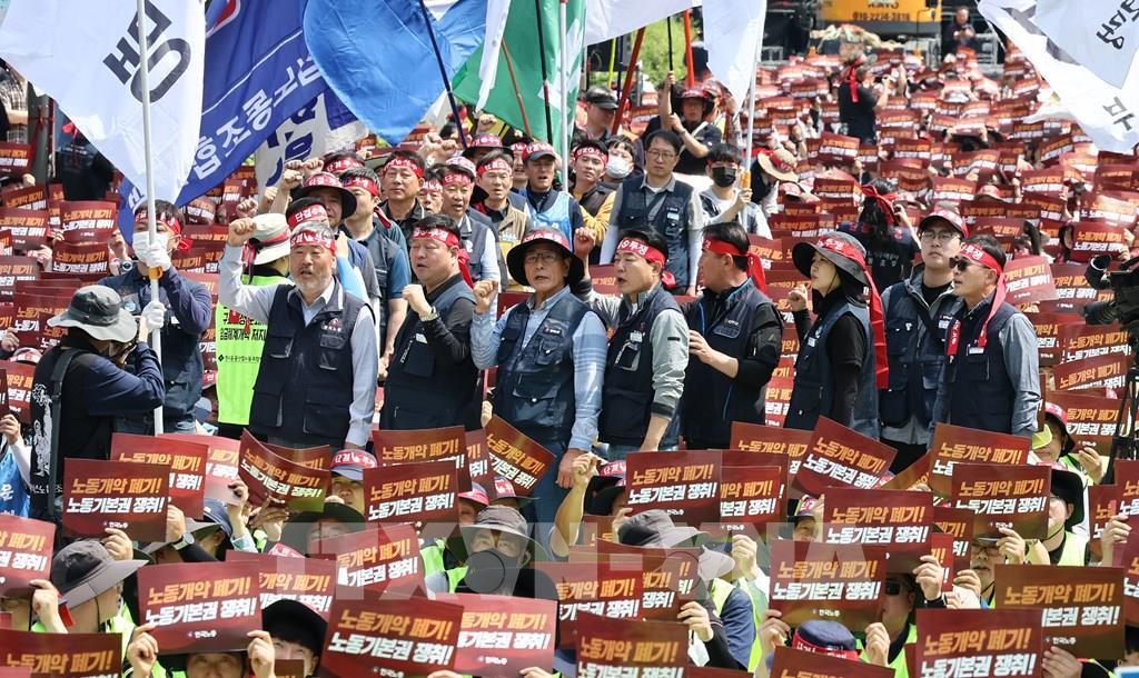 Công nhân, nhà hoạt động và những người lao động thuộc nhiều ngành nghề tại các nước châu Á đã xuống đường tuần hành nhân Ngày Quốc tế Lao động 1/5, kêu gọi được tạo điều kiện làm việc tốt hơn và quyền lợi nhiều hơn. Ảnh: Tuần hành nhân Ngày Quốc tế Lao động tại Seoul, Hàn Quốc ngày 1/5/2024. Yonhap/TTXVN