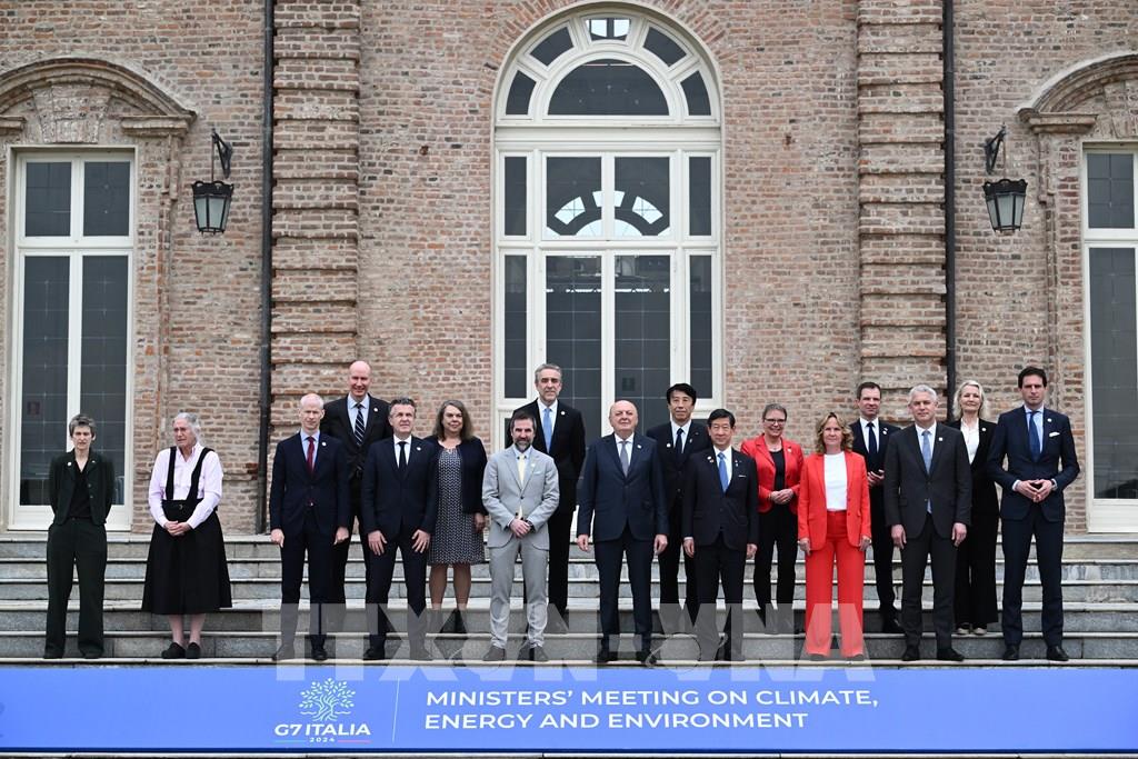 Các phương tiện truyền thông Italy ngày 29/4/2024 đồng loạt đưa tin về việc Bộ trưởng Năng lượng các nước thành viên Nhóm Các nước công nghiệp phát triển (G7) đã cam kết đóng cửa các nhà máy điện sử dụng than chậm nhất là vào năm 2035. Ảnh: Các đại biểu chụp ảnh chung tại cuộc họp Bộ trưởng Năng lượng các nước thành viên Nhóm G7 về khí hậu, năng lượng và môi trường ở Turin, Italy ngày 29/4/2024. AFP/TTXVN