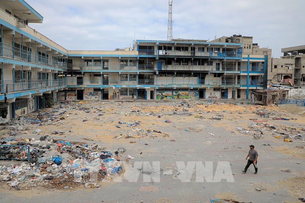 Ngày 30/4/2024, Tổng Thư ký Liên hợp quốc (LHQ) Antonio Guterres kêu gọi Israel không tấn công thành phố Rafah ở phía Nam Gaza, đồng thời nêu rõ một chiến dịch tấn công vào Rafah "sẽ gây tác động thảm khốc đối với người Palestine ở Gaza, đồng thời ảnh hưởng nghiêm trọng đến khu Bờ Tây bị chiếm đóng cũng như toàn khu vực". Ảnh: Một trường học tại Gaza bị hư hại sau cuộc không kích của Israel. THX/TTXVN