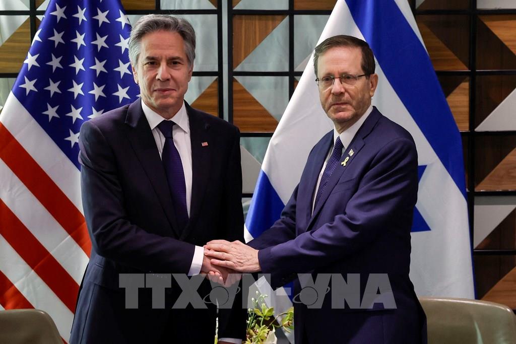 Tại cuộc hội kiến Tổng thống Israel Isaac Herzog (phải) ở Tel Aviv ngày 1/5/2024, Ngoại trưởng Mỹ Antony Blinken (trái) cam kết ưu tiên việc đưa con tin về nhà đoàn tụ với gia đình, đồng thời kêu gọi lực lượng Hamas chấp nhận thỏa thuận ngừng bắn đổi lấy con tin mà Israel đề xuất. Ảnh: AFP/TTXVN