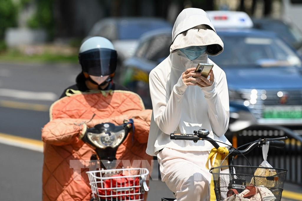 Khả năng thích ứng với biến đổi khí hậu của các nước châu Á đang là vấn đề đáng lo ngại khi nhiều nước khu vực này liên tục phải hứng chịu đợt nắng nóng với nhiệt độ tăng cao kỷ lục vào cuối tháng 5/2023, thời điểm thời tiết thường mát mẻ hơn khi bắt đầu mùa mưa. Trong ảnh: Người dân mặc áo chống nắng trên đường phố tại Thượng Hải, Trung Quốc, ngày 29/5/2023. Ảnh: AFP/TTXVN