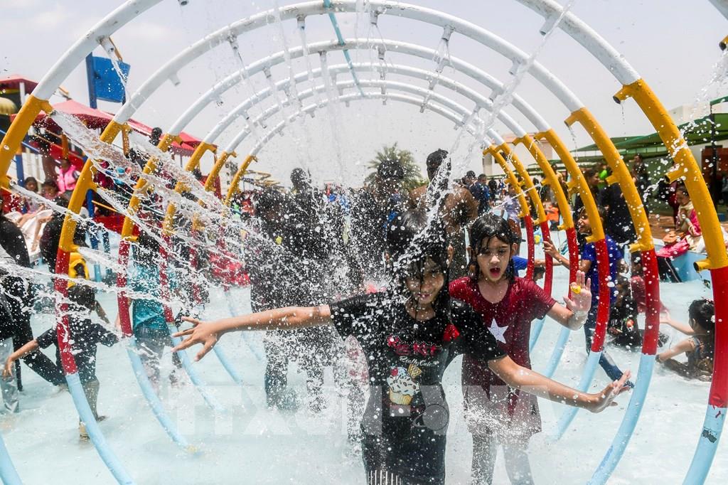 Khả năng thích ứng với biến đổi khí hậu của các nước châu Á đang là vấn đề đáng lo ngại khi nhiều nước khu vực này liên tục phải hứng chịu đợt nắng nóng với nhiệt độ tăng cao kỷ lục vào cuối tháng 5/2023, thời điểm thời tiết thường mát mẻ hơn khi bắt đầu mùa mưa. Trong ảnh: Trẻ em chơi đùa trong công viên nước để tránh nóng, tại Karachi, Pakistan, ngày 27/5/2023. Ảnh: AFP/TTXVN