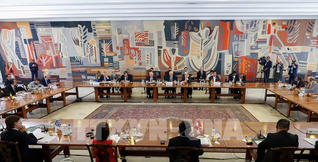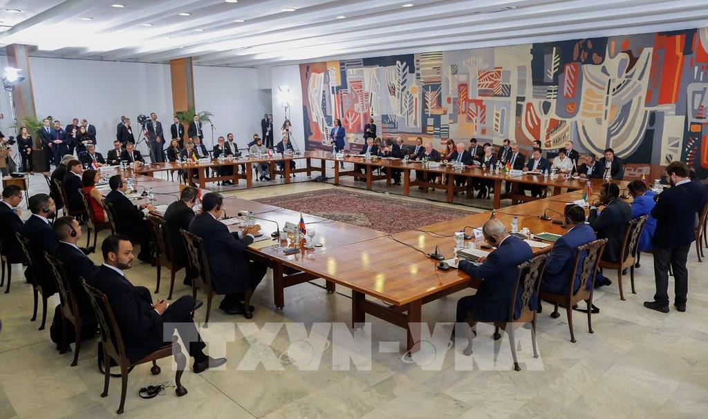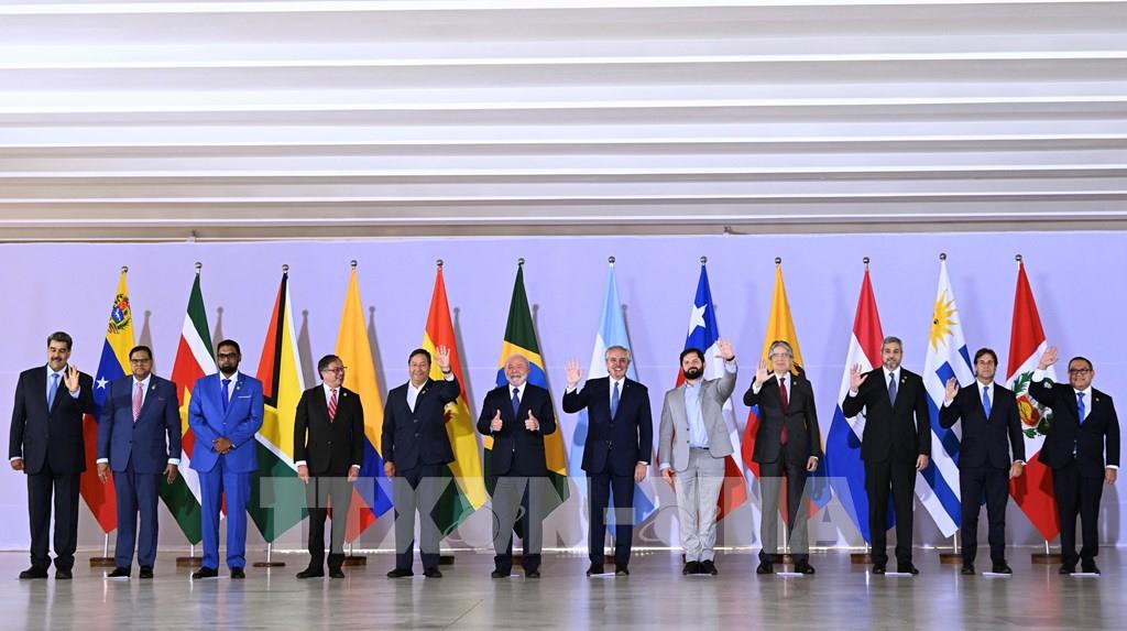 Ngày 30/5/2023, Hội nghị thượng đỉnh các nhà lãnh đạo Nam Mỹ ở thủ đô Brasilia của Brazil đã ra tuyên bố chung, trong đó ưu tiên thúc đẩy hợp tác và hội nhập khu vực. Trong tuyên bố chung “Đồng thuận Brasilia”, lãnh đạo của 12 quốc gia Nam Mỹ nhất trí tăng cường quan hệ giữa các nước, thúc đẩy hòa bình và hợp tác dựa trên đối thoại và tôn trọng sự đa dạng của các dân tộc. Ảnh: AFP/TTXVN