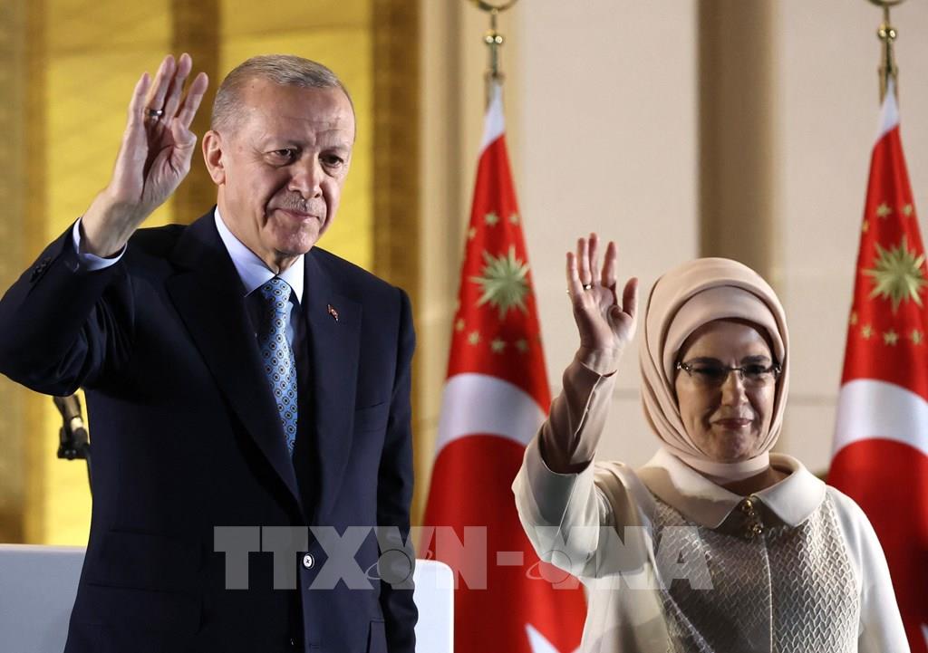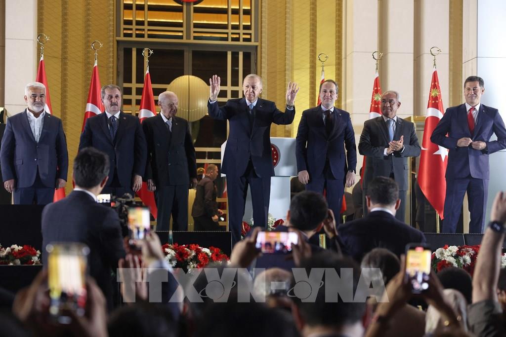 Với 52,14% số phiếu ủng hộ trong vòng 2 của cuộc bầu cử Tổng thống Thổ Nhĩ Kỳ, Tổng thống Recep Tayyip Erdogan đã đánh bại đối thủ Kemal Kilicdaroglu, tiếp tục lãnh đạo đất nước thêm một nhiệm kỳ 5 năm nữa. Trong ảnh: Tổng thống Thổ Nhĩ Kỳ Tayyip Erdogan (giữa) phát biểu trước những người ủng hộ sau khi giành chiến thắng trong cuộc bầu cử Tổng thống vòng hai, tại Ankara ngày 29/5/2023. Ảnh: AFP/TTXVN