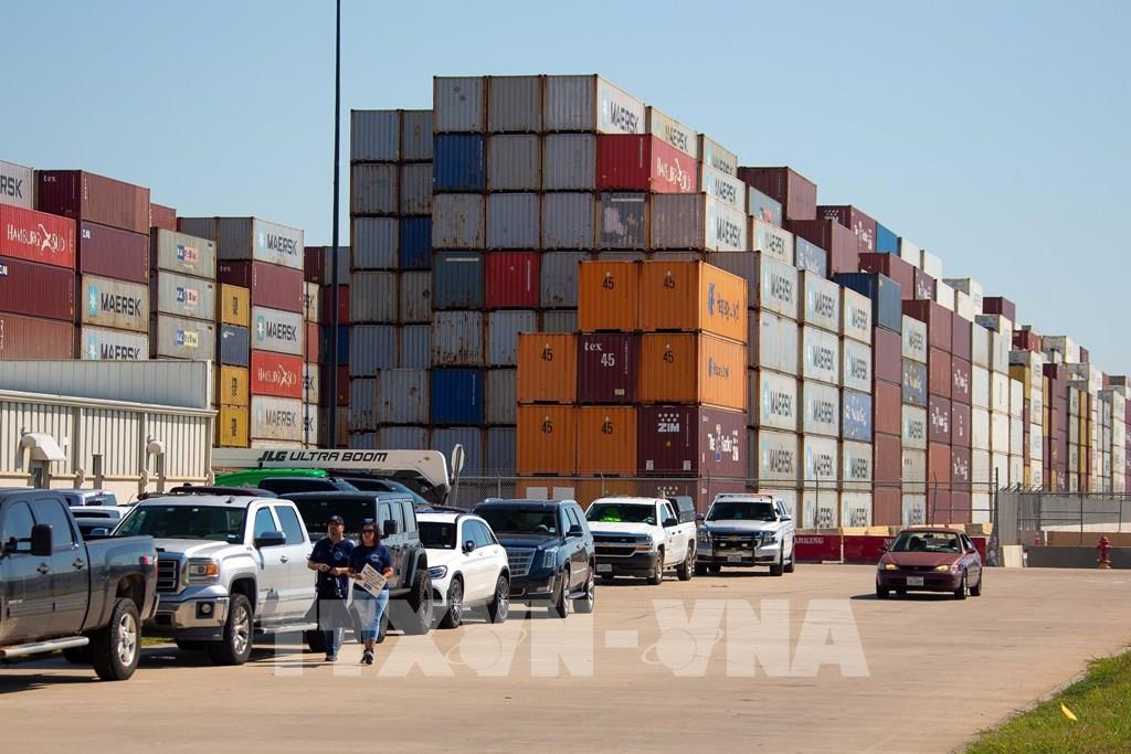 Ngày 1/10/2024, sau khi các cuộc thỏa thuận về một hợp đồng tiền lương mới đổ vỡ, công nhân bốc xếp tại các cảng ở Bờ Đông và Vịnh Mexico của Mỹ đã bắt đầu đình công, gây ngưng trệ khoảng 50% hoạt động vận chuyển đường biển của nước này. Trong ảnh: Nhân viên cảng Houston, bang Texas, Mỹ tham gia đình công ngày 1/10/2024. Ảnh: THX/TTXVN