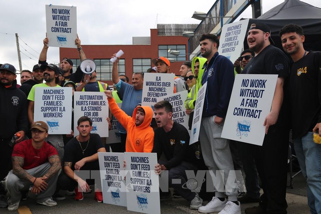 Ngày 1/10/2024, sau khi các cuộc thỏa thuận về một hợp đồng tiền lương mới đổ vỡ, công nhân bốc xếp tại các cảng ở Bờ Đông và Vịnh Mexico của Mỹ đã bắt đầu đình công, gây ngưng trệ khoảng 50% hoạt động vận chuyển đường biển của nước này. Trong ảnh: Nhân viên cảng tham gia đình công tại Brooklyn, New York, Mỹ, ngày 1/10/2024. Ảnh: THX/TTXVN