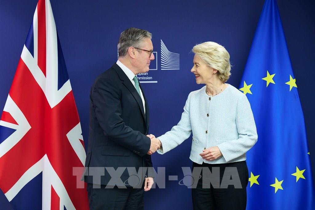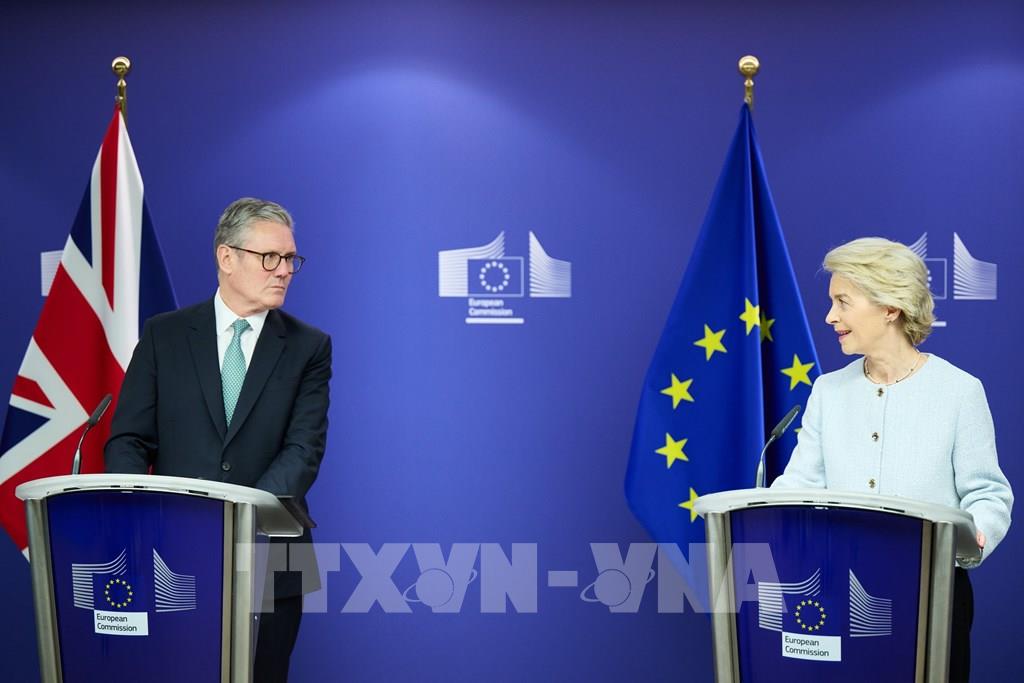 Vương quốc Anh và Liên minh châu Âu (EU) đã nhất trí đẩy mạnh chương trình hợp tác, với việc tổ chức một hội nghị thượng đỉnh dự kiến diễn ra vào đầu năm tới để tái thiết lập mối quan hệ. Trong tuyên bố chung ngày 2/10/2024 tại Brussels, Bỉ, Chủ tịch Ủy ban châu Âu (EC) Ursula von der Leyen (phải) và Thủ tướng Anh Keir Starmer (trái) khẳng định sẽ cùng nhau xác định những lĩnh vực hợp tác có lợi cho cả hai bên, bao gồm kinh tế, năng lượng, an ninh. Ảnh: AA/TTXVN