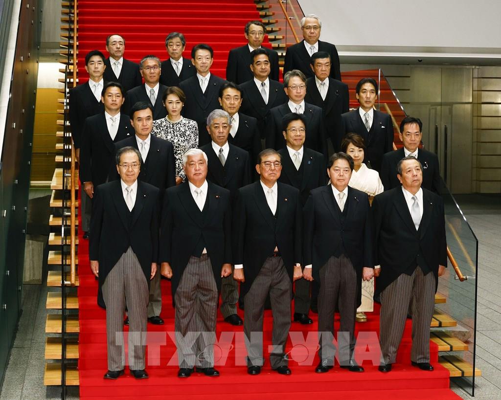 Ngày 1/10/2024, Quốc hội Nhật Bản đã họp phiên bất thường và bầu Chủ tịch đảng Dân chủ Tự do (LDP) Shigeru Ishiba làm Thủ tướng thứ 102 của nước này. Theo kết quả cuộc bỏ phiếu, ông Shigeru Ishiba nhận được 291 trong tổng số 461 phiếu hợp lệ tại Hạ viện. Trong ảnh: Tân Thủ tướng Nhật Bản Shigeru Ishiba cùng các thành viên nôi các sau lễ tuyên thệ nhậm chức tại Tokyo, ngày 1/10/2024. Ảnh: Kyodo/TTXVN