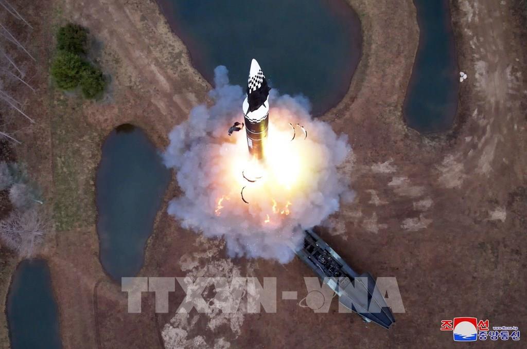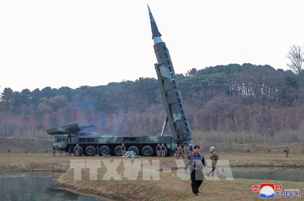Ngày 2/4/2024, Nhà lãnh đạo Triều Tiên Kim Jong-un đã chỉ đạo việc phóng thử tên lửa tầm trung thế hệ mới Hwasongpho-16B, có sử dụng nhiên liệu rắn và trang bị đầu đạn siêu vượt âm mới phát triển gần đây. Ảnh: THX/TTXVN