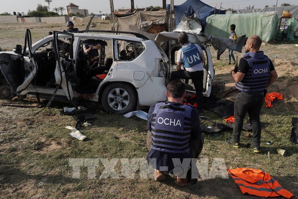 Khu vực Trung Đông vốn bất ổn nay càng thêm căng thẳng khi ngày 1/4/2024, Israel tiến hành vụ không kích vào tòa nhà lãnh sự Iran ở thủ đô Damascus của Syria, khiến chỉ huy cấp cao của lực lượng Quds thuộc Lực lượng Vệ binh Cách mạng Hồi giáo Iran (IRGC) cùng một số nhà ngoại giao thiệt mạng. Iran tuyên bố sẽ đáp trả mạnh mẽ. Trong khi đó, ngày 3/4, quân đội Israel cũng không kích nhầm vào chiếc xe của tổ chức viện trợ lương thực World Central Kitchen (Mỹ- ảnh), làm 7 thành viên WCK thiệt mạng. Cộng đồng quốc tế đã lên án các vụ tấn công này. Ảnh: AFP/TTXVN