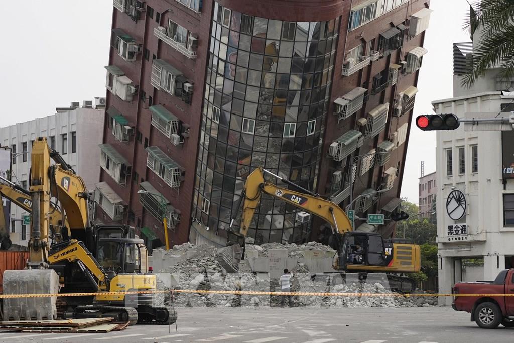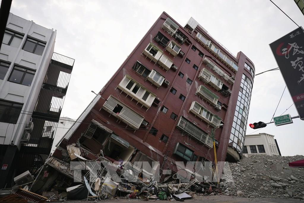 Một trận động đất có độ lớn 7,3 xảy ra sáng 3/4/2024 tại Đài Loan, Trung Quốc, làm ít nhất 9 người thiệt mạng, hơn 1000 người bị thương, 34 người mất tích, hàng chục tòa nhà bị phá hủy. Đây là trận động đất lớn nhất tại vùng lãnh thổ này kể từ năm 1999, thời điểm từng xảy ra trận động đất độ lớn 7,6 làm khoảng 2.400 người thiệt mạng. Ảnh: AFP/TTXVN
