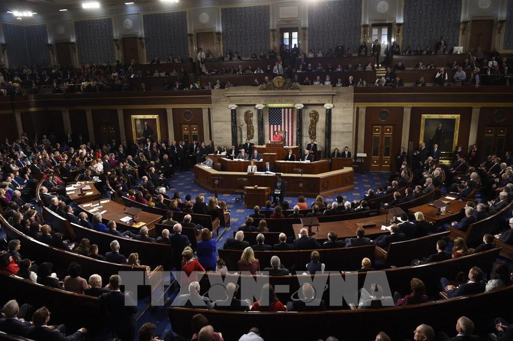 Ngày 7/10/2021, với 50 phiếu thuận và 48 phiếu chống, Thượng viện Mỹ đã phê chuẩn dự luật tạm thời nâng mức trần nợ công của Chính phủ liên bang, theo đó tăng mức trần nợ công 28.400 tỷ USD của Mỹ hiện nay thêm 480 tỷ USD, tránh nguy cơ vỡ nợ vào cuối tháng này. Trong ảnh (tư liệu): Toàn cảnh phiên họp Quốc hội Mỹ tại Washington, DC. Ảnh: AFP/ TTXVN