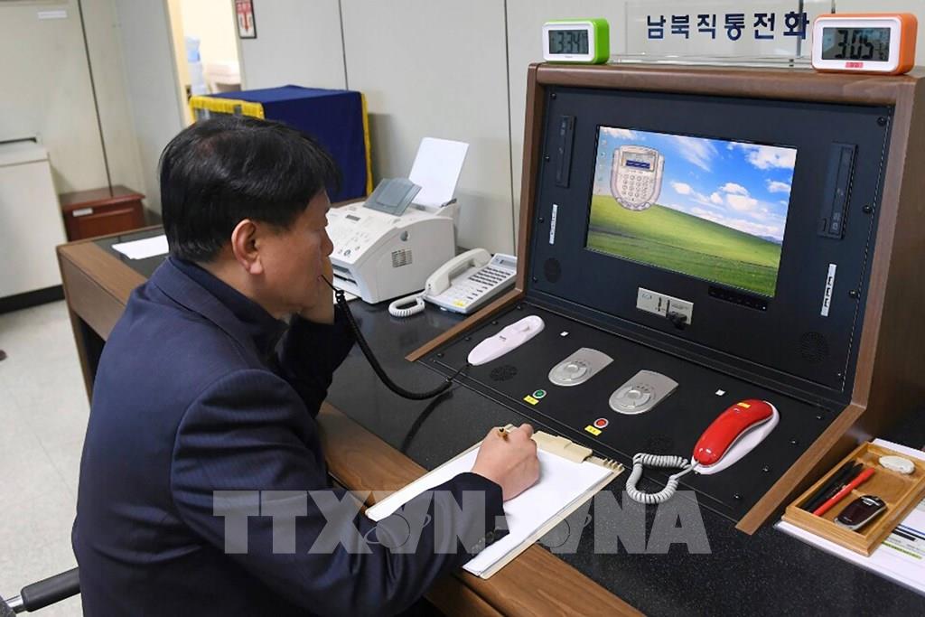 Hãng thông tấn Trung ương Triều Tiên (KCNA) ngày 4/10/2021 đưa tin nước này bắt đầu khôi phục đường dây nóng liên Triều từ 9h00 sáng cùng ngày (giờ địa phương). Trong ảnh (tư liệu): Một quan chức Chính phủ Hàn Quốc liên lạc với nhà chức trách Triều Tiên qua đường dây nóng đặt tại làng đình chiến Panmunjom ở Paju (Hàn Quốc), ngày 3/1/2018. Ảnh: AP/TTXVN
