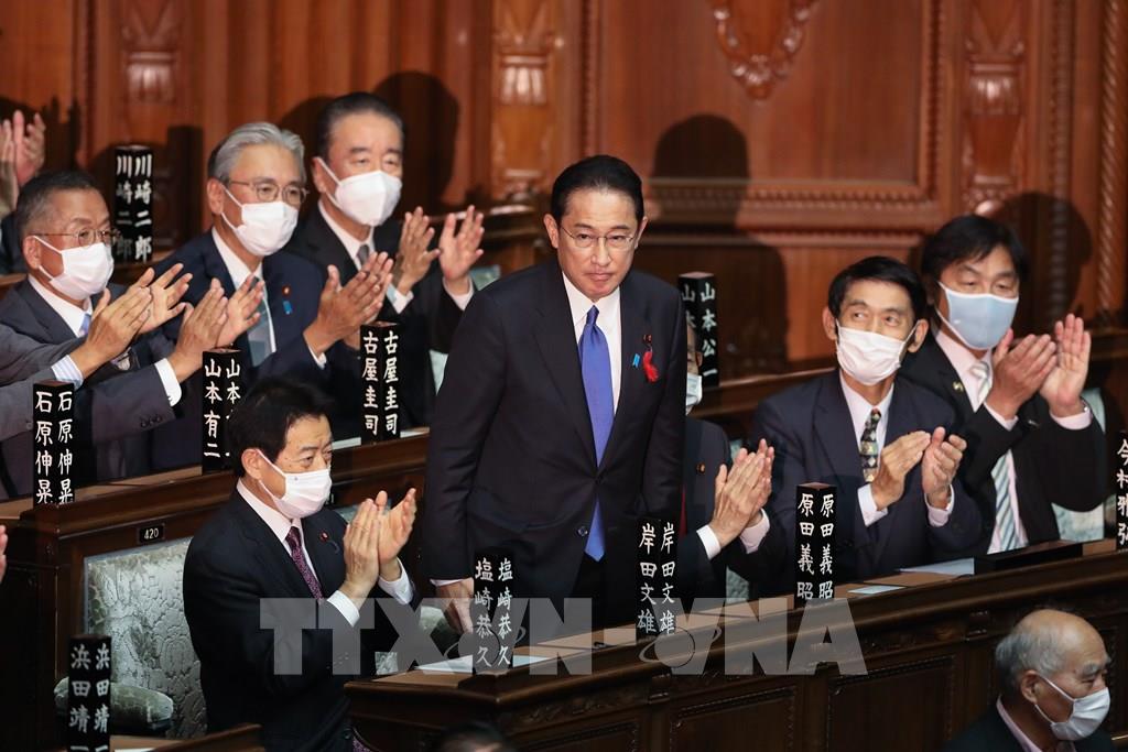 Ngày 4/10/2021, tân Thủ tướng Nhật Bản Fumio Kishida và Nội các đã tuyên thệ nhậm chức trong buổi lễ được tổ chức trang trọng ở Hoàng Cung. Phát biểu trong cuộc họp báo đầu tiên trên cương vị Thủ tướng, ông Kishida nhấn mạnh ứng phó với dịch COVID-19 và khôi phục các hoạt động kinh tế, xã hội là những nhiệm vụ cấp bách và ưu tiên hàng đầu. Trong ảnh: Ông Fumio Kishida (giữa) được Quốc hội Nhật Bản bầu làm Thủ tướng mới, tại Tokyo, ngày 4/10/2021. Ảnh: THX/TTXVN