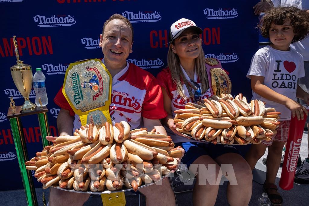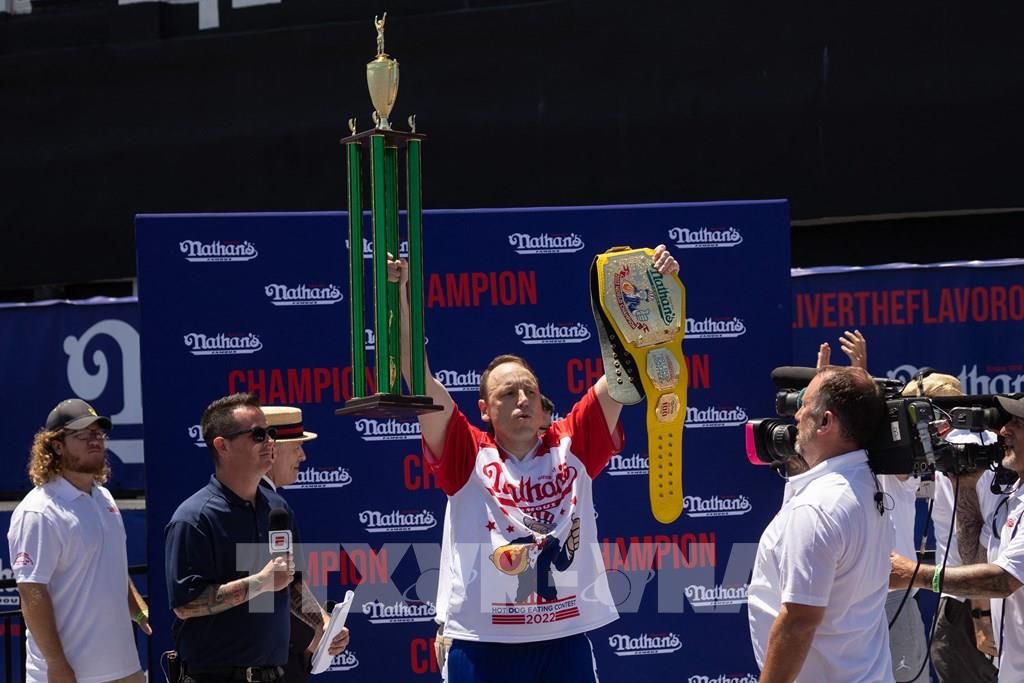 Ăn hết 63 chiếc bánh mỳ kẹp xúc xích (hotdog) trong thời gian 10 phút, Joey Chestnut (trái) đã trở thành người vô địch tại cuộc thi ăn hot dog (Nathan's Hot Dog Eating Contest) – một sự kiện ẩm thực đặc trưng kiểu Mỹ được tổ chức tại đảo Coney (New York) đúng Ngày Quốc khánh Mỹ (4/7/2022). Đây là chiến thắng thứ 15 Chestnut giành được. Ảnh: AFP/ TTXVN